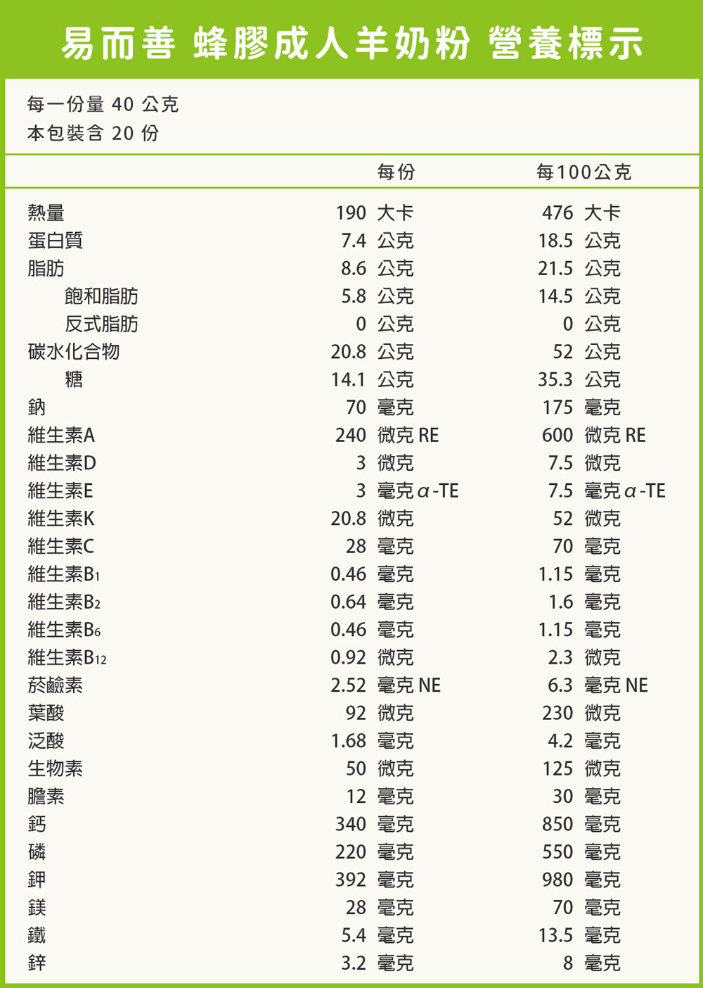 易而善蜂膠成人羊奶粉以羊奶為重點成分,特別是生產過程中減少羊羶味,而羊奶的脂肪與蛋白質分子小,讓人體好消化、更好吸收。蜂膠成分,增加並調整體質