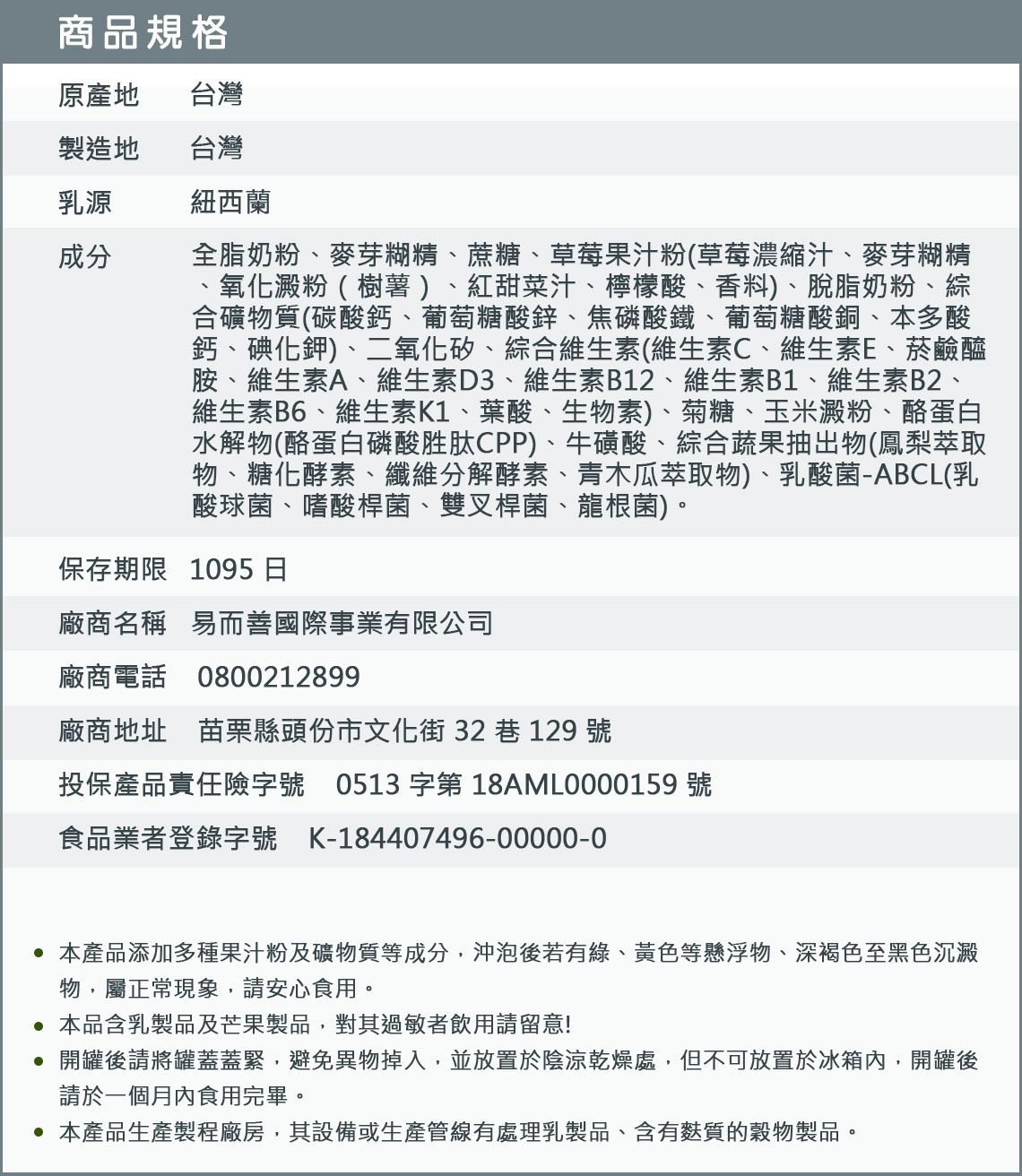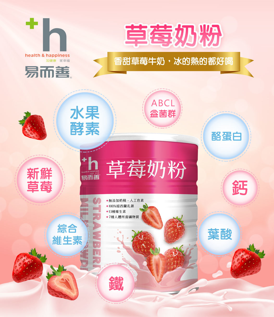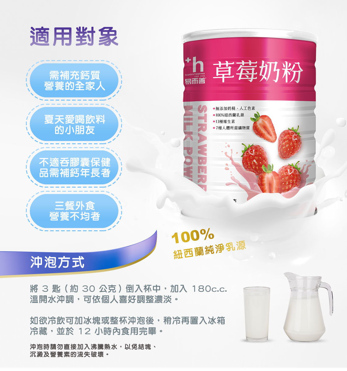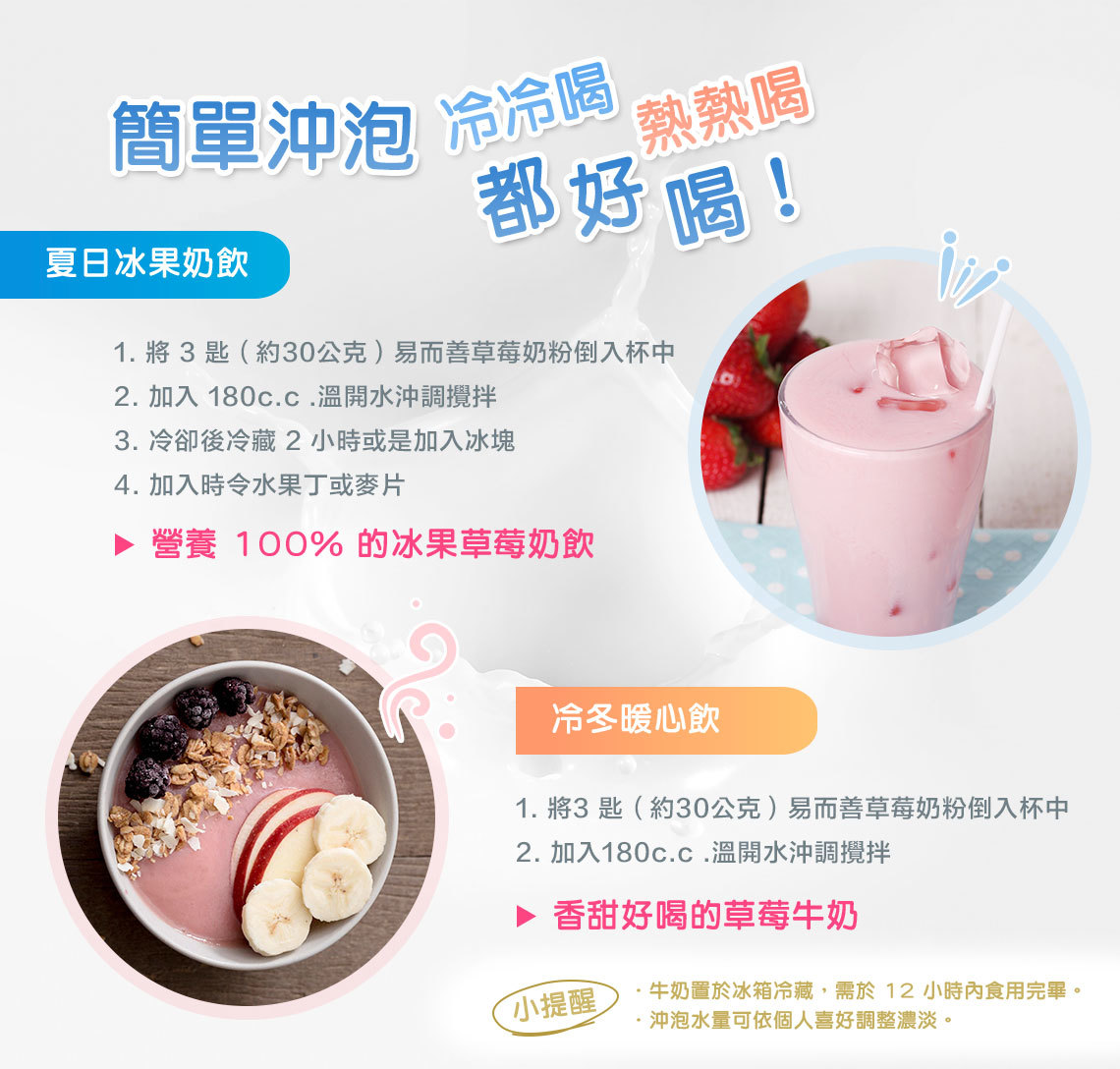 易而善 草莓奶粉,以紐西蘭嚴格品質控管的高品質 100% 紐西蘭牛乳,