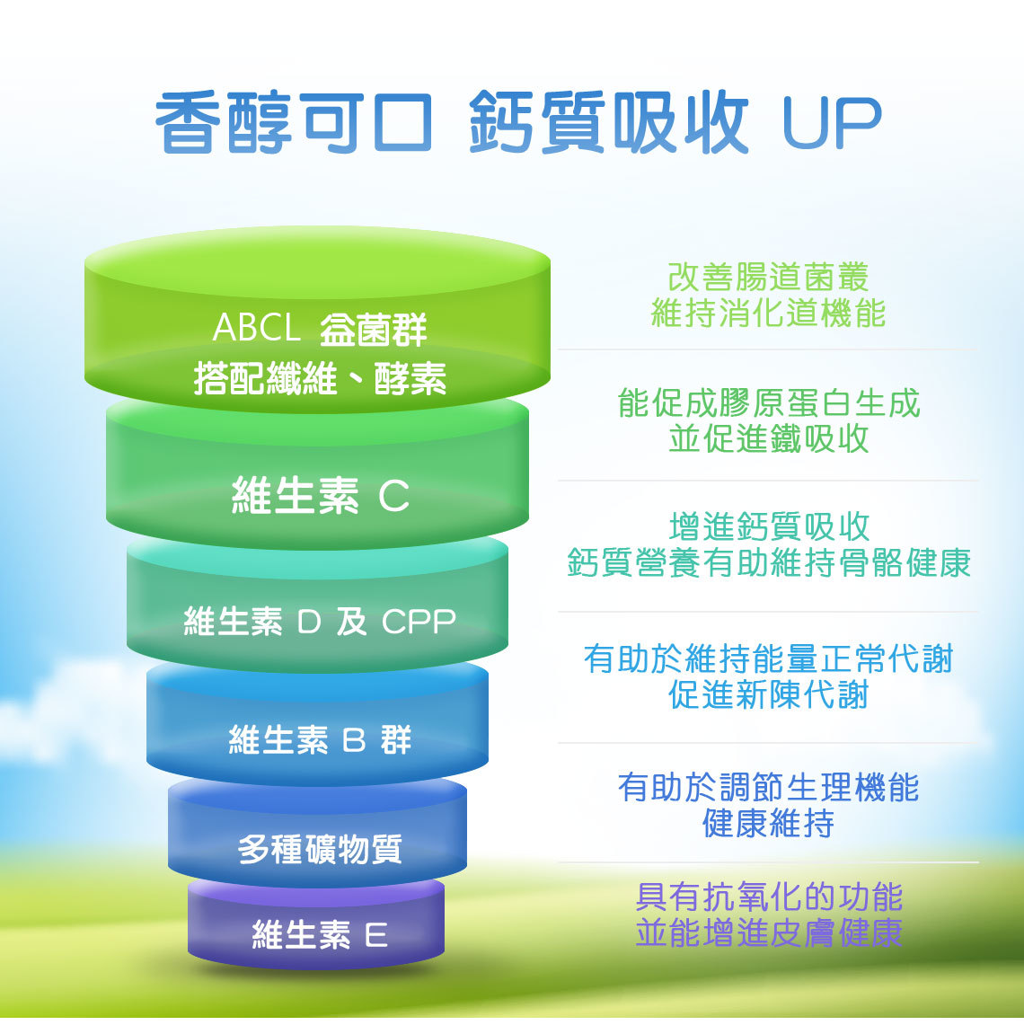 鈣質及維生素 D:幫助鈣質吸收,鈣質維持骨骼及牙齒健康,調節生理機能。