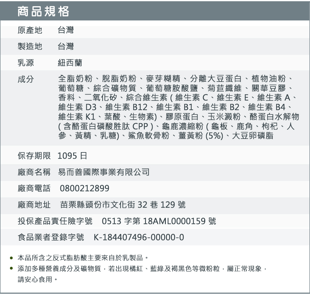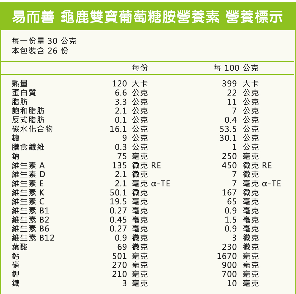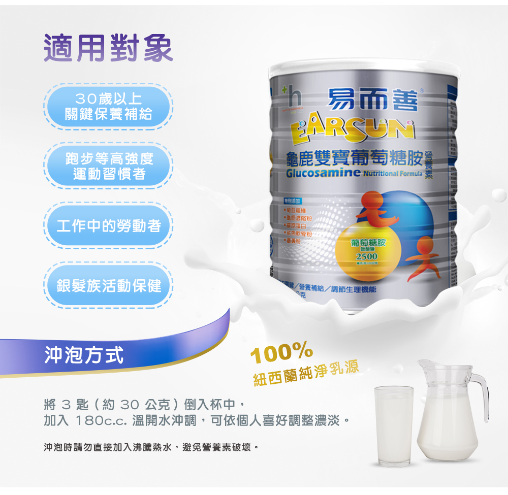 易而善 龜鹿雙寶葡萄糖胺營養素奶粉,含有龜、鹿、薑黃漢方補養,
