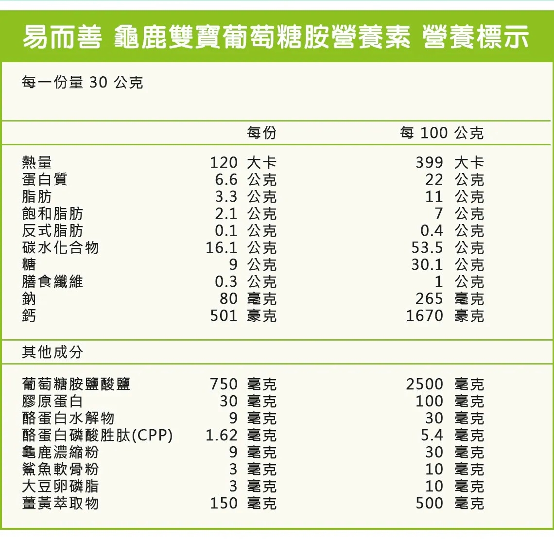 易而善 龜鹿雙寶葡萄糖胺營養素奶粉,含有龜板、鹿角、薑黃漢方補養,