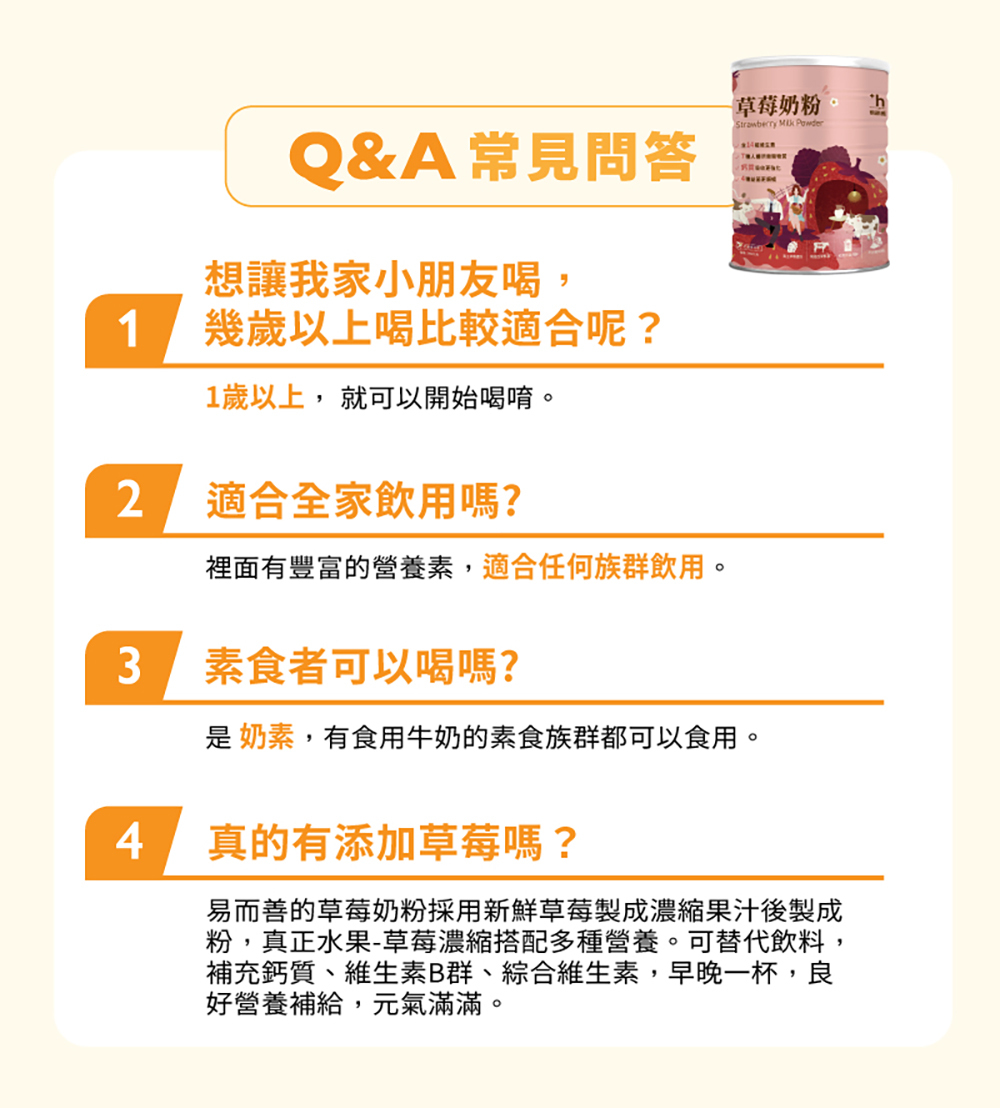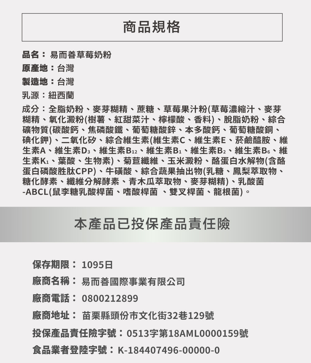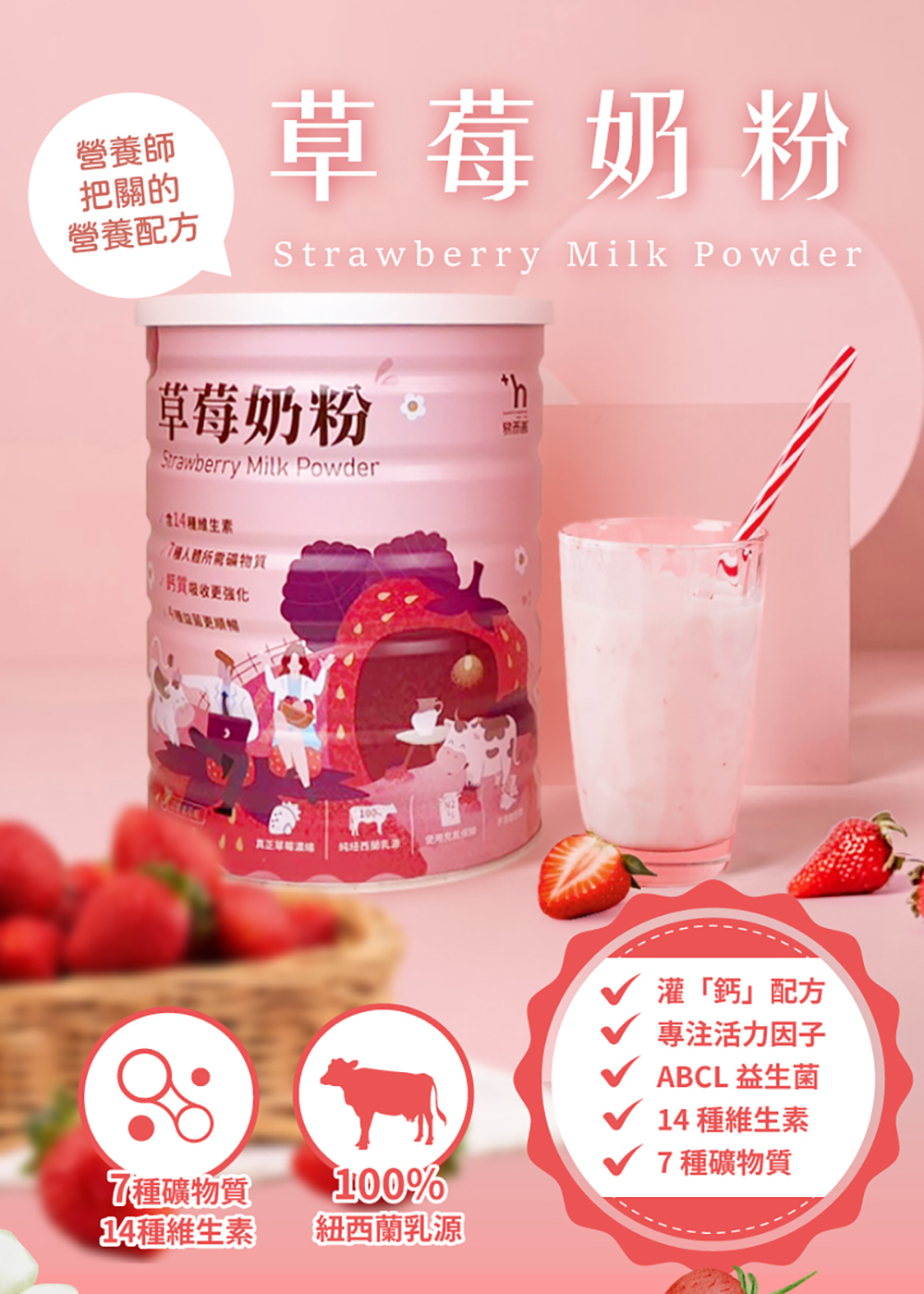 易而善 草莓奶粉,以紐西蘭嚴格品質控管的高品質 100% 紐西蘭牛乳,
