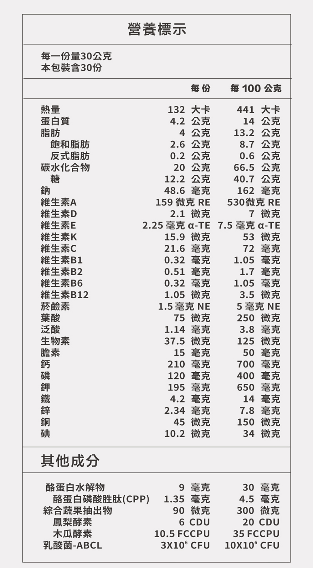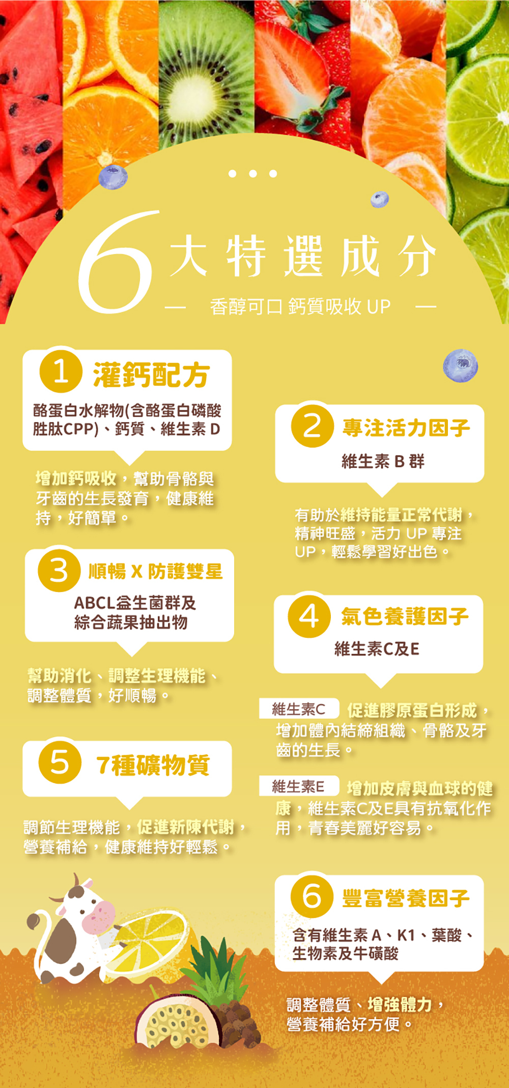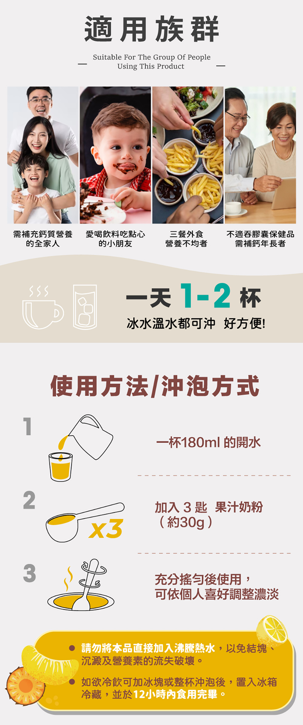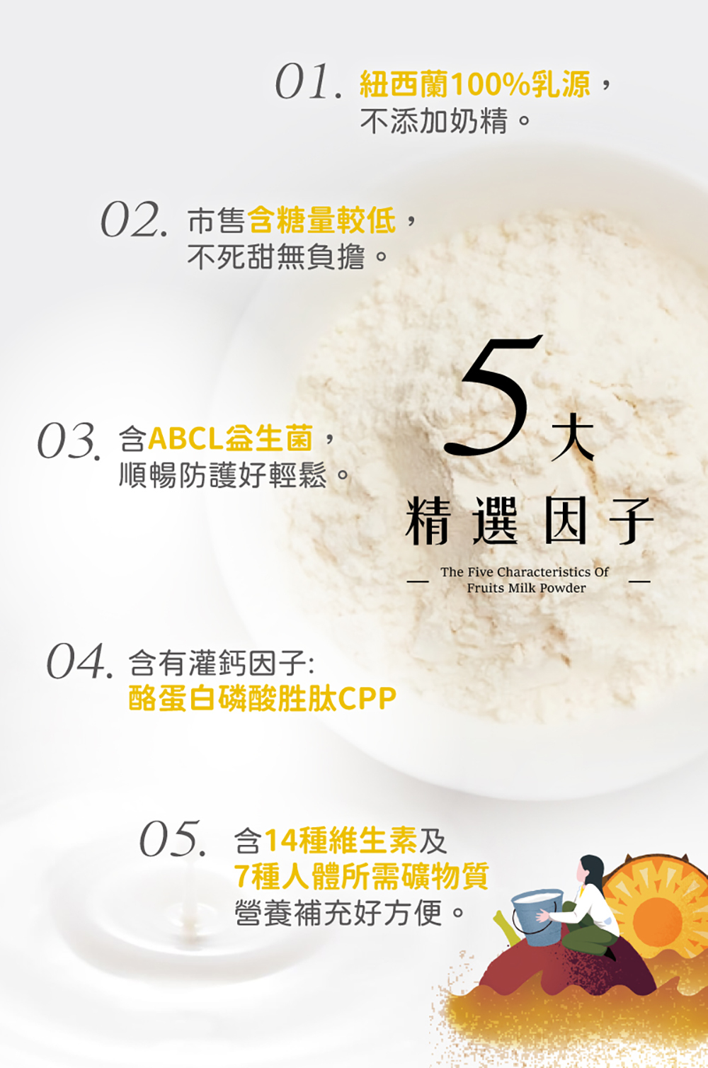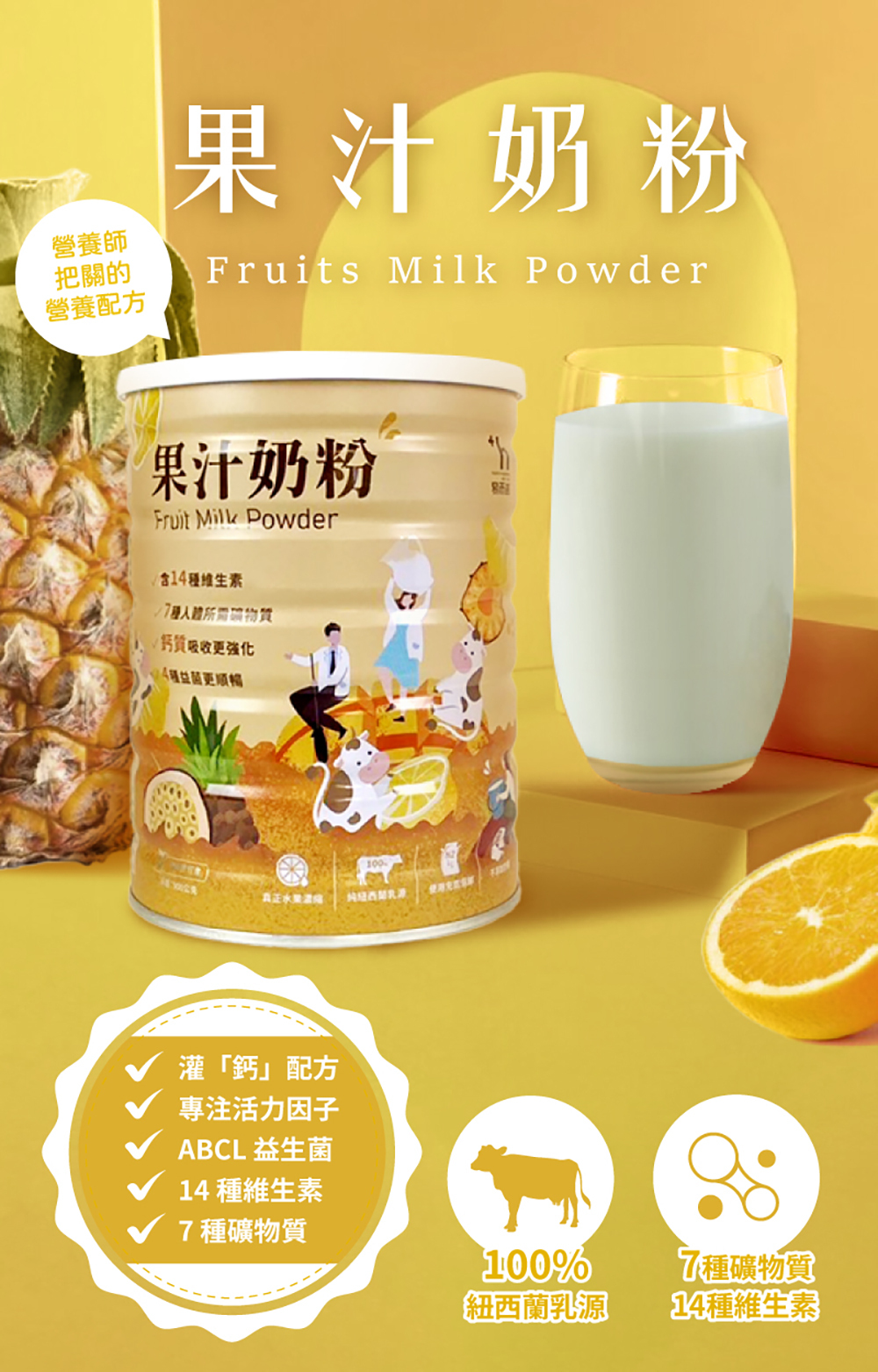 新鮮水果乾燥成粉,搭配高鈣、高鐵及多種維生素及礦物質,