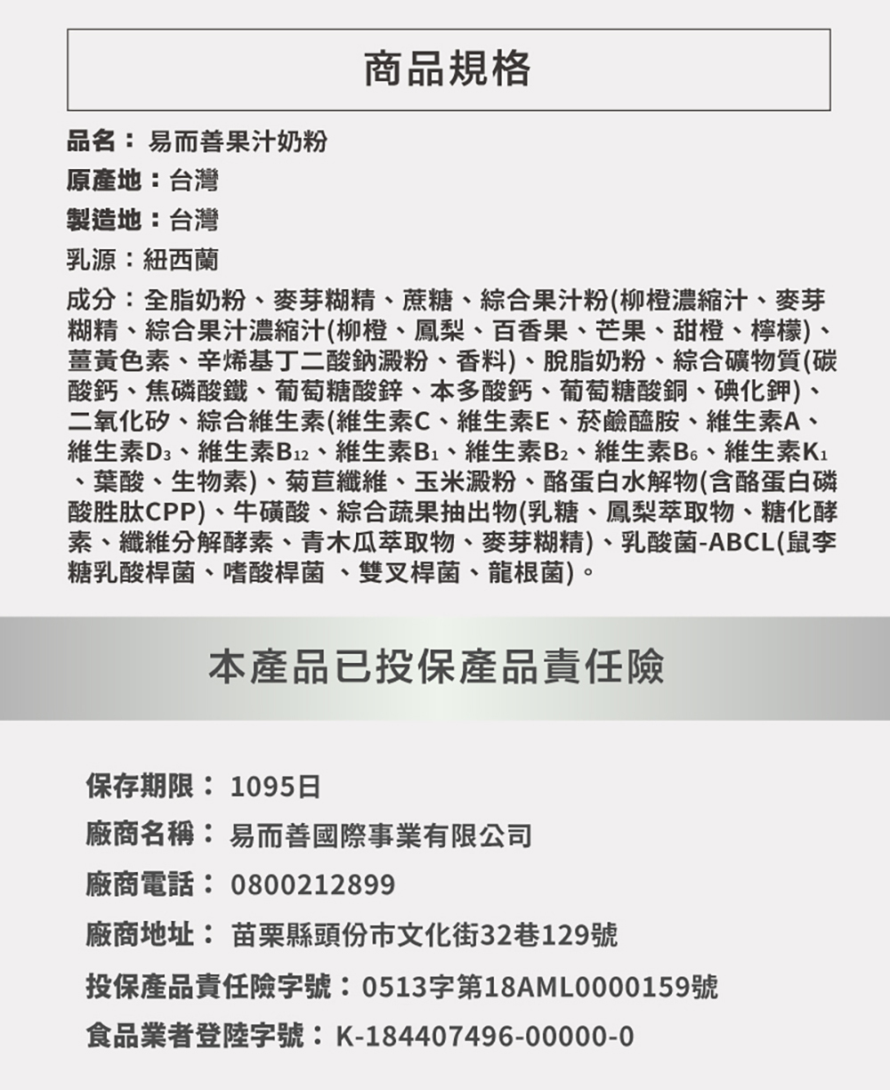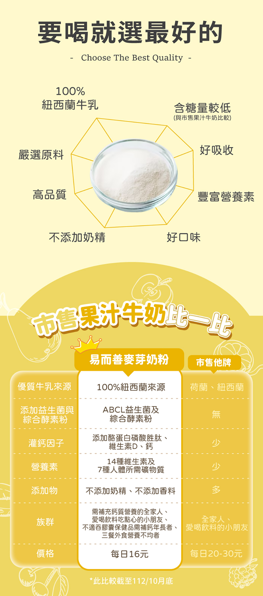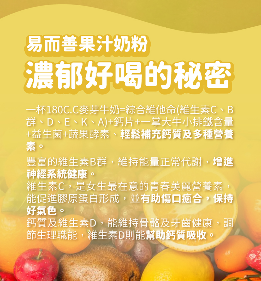 易而善 果汁奶粉,以紐西蘭嚴格品質控管的高品質 100% 紐西蘭牛乳,
