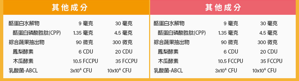 含六種蛋白質:乳清蛋白、大豆蛋白、初乳蛋白、藻青蛋白、乳鐵蛋白、酪蛋白磷酸胜肽