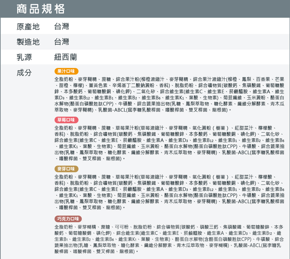 嚴選100%紐西蘭乳源,優質蛋白質比例充足,高效率補充。