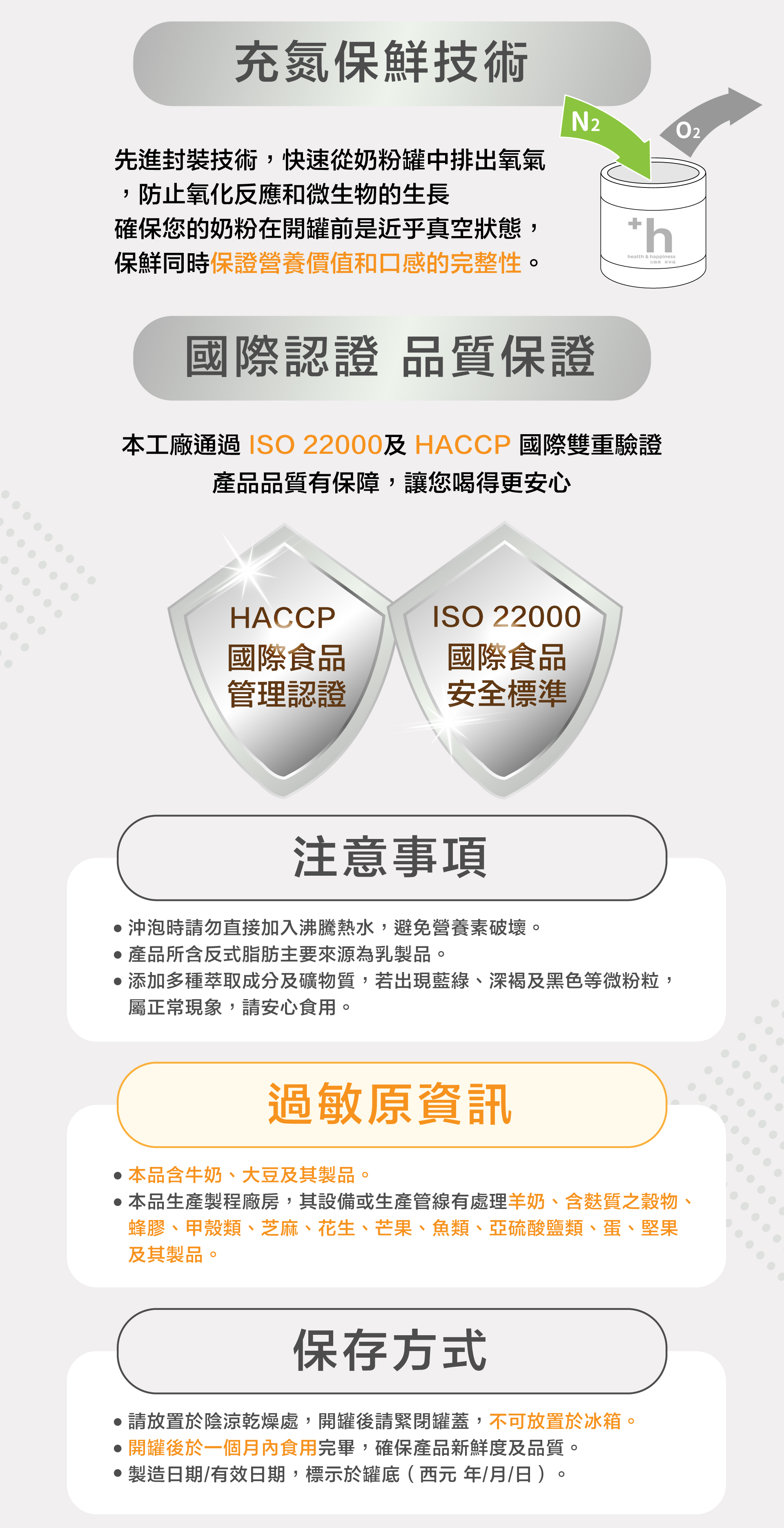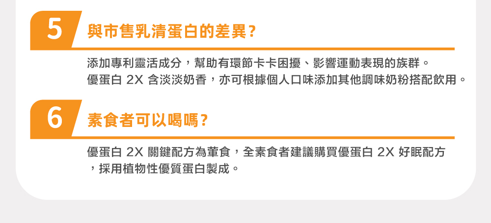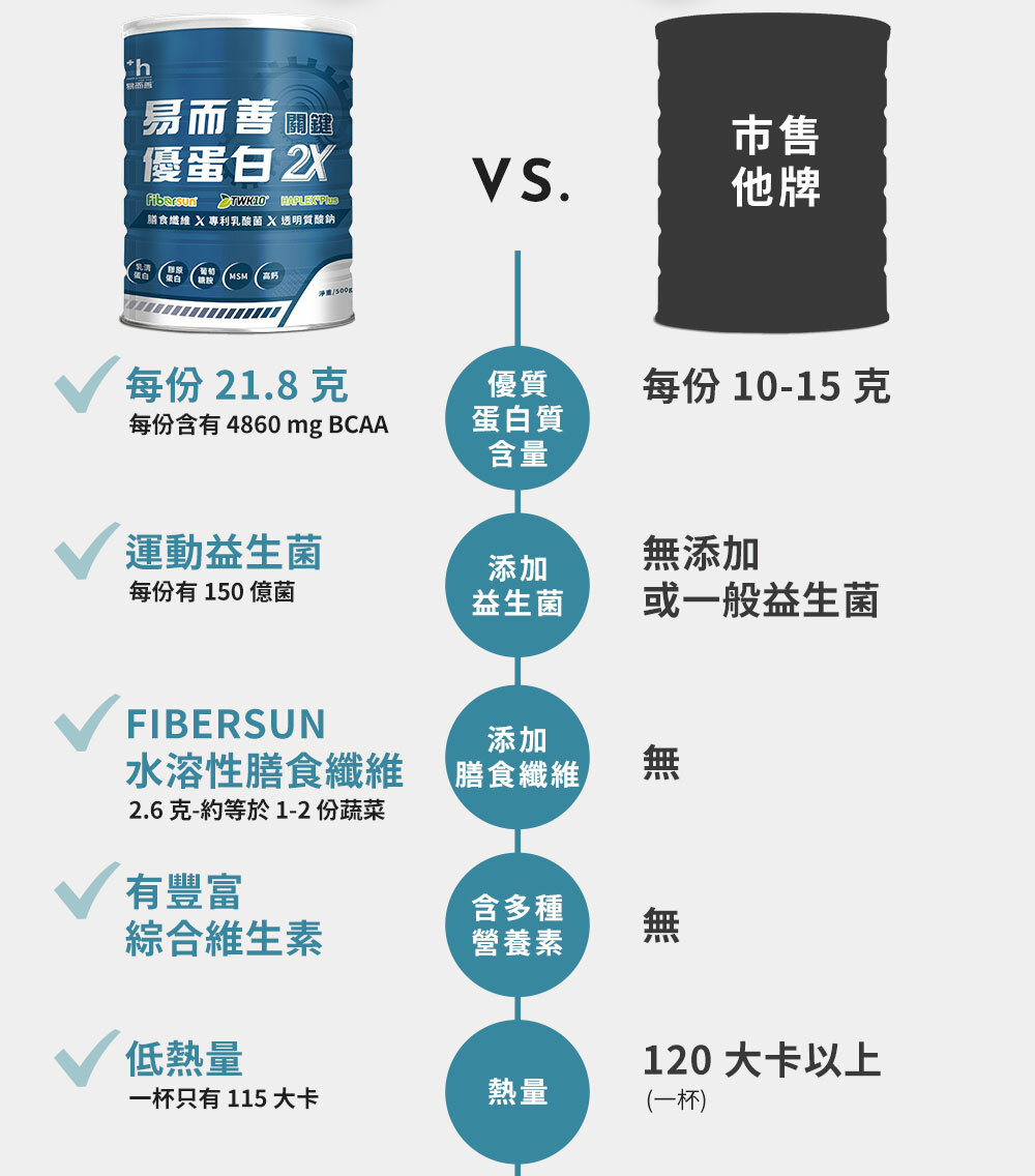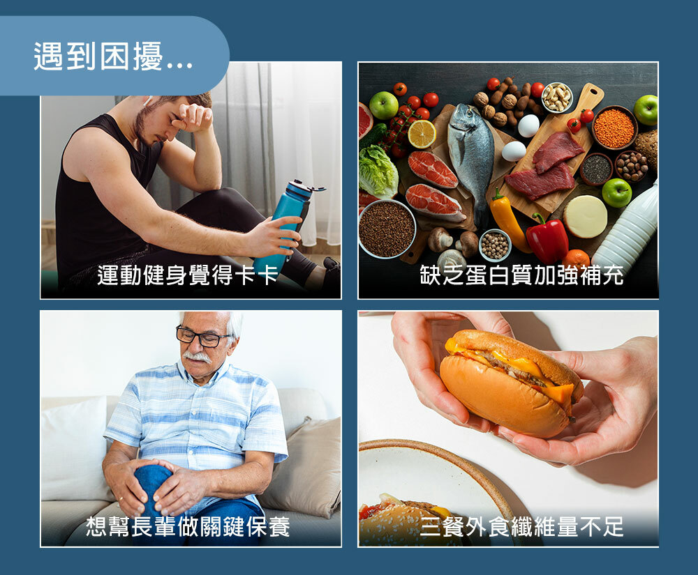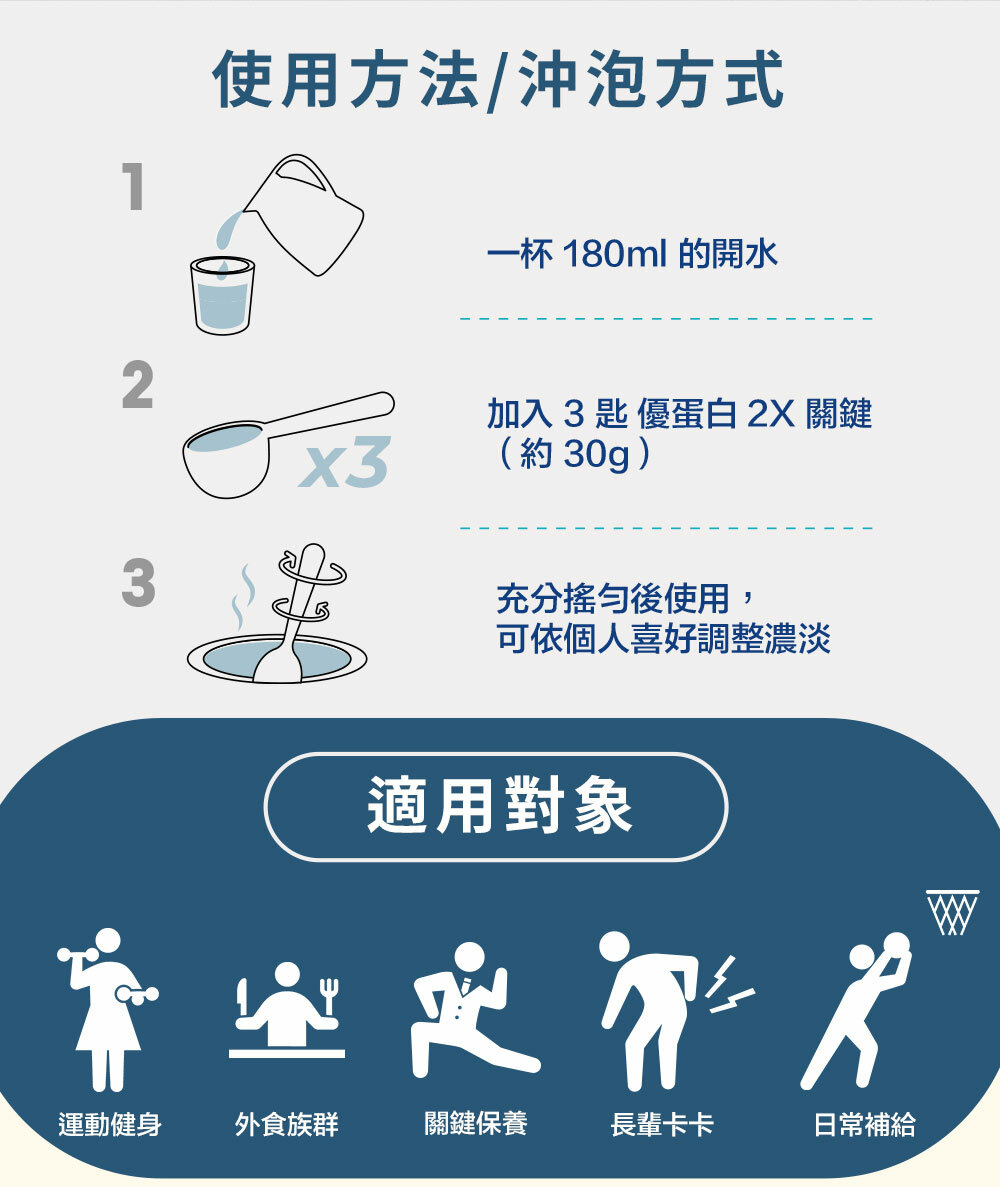 每份21.8公克蛋白質,由乳清蛋白及膠原蛋白組成,蛋白質補充足,動力提升更穩固!