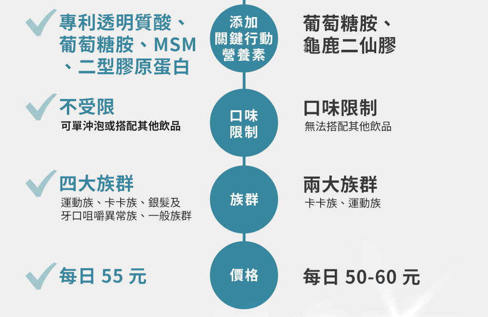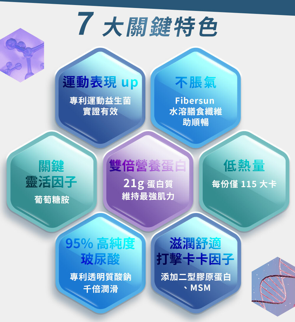 MSM、HAPLEX®Plus 透明質酸鈉,二型膠原蛋白、葡萄糖胺及高鈣,有助骨骼健康