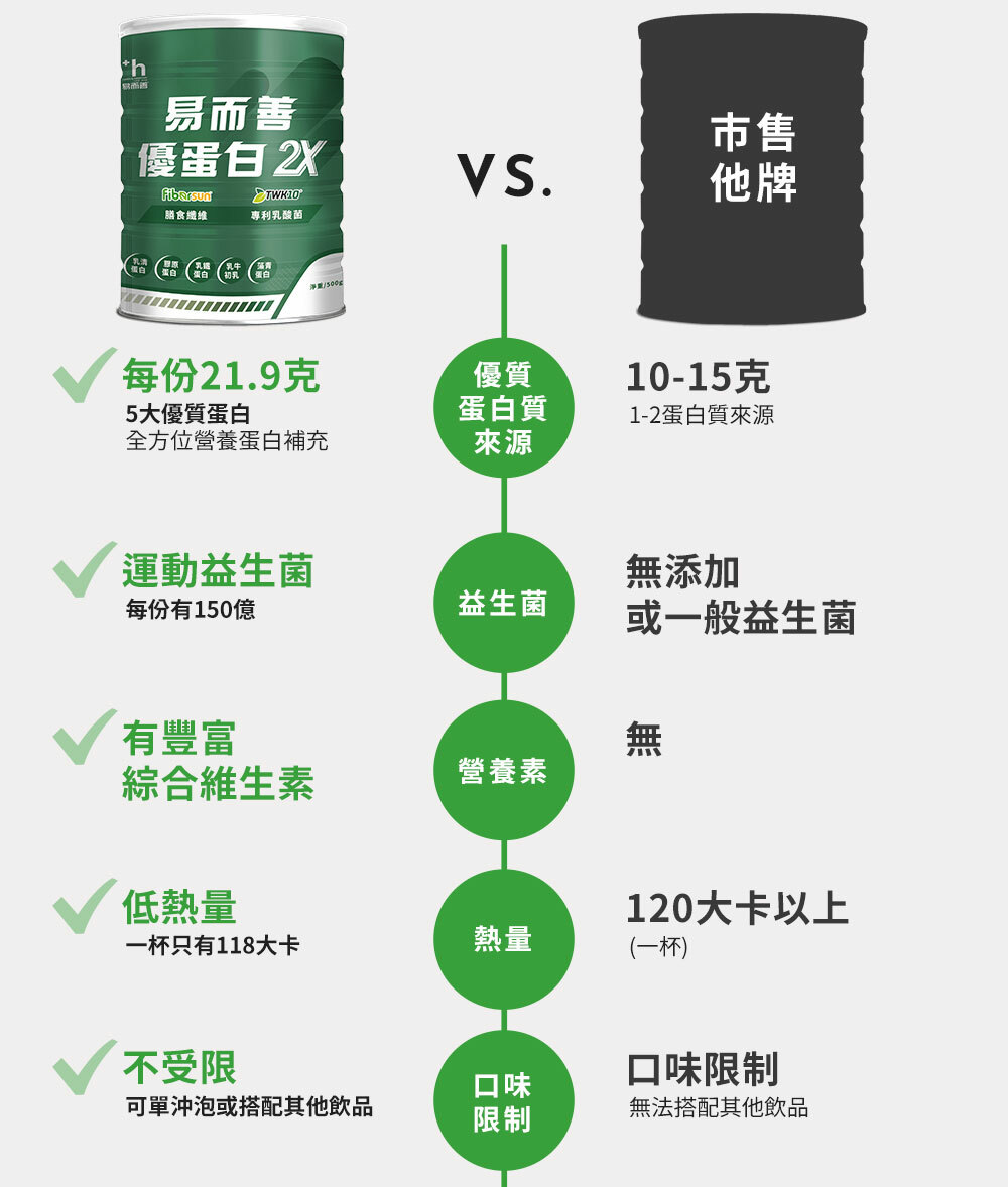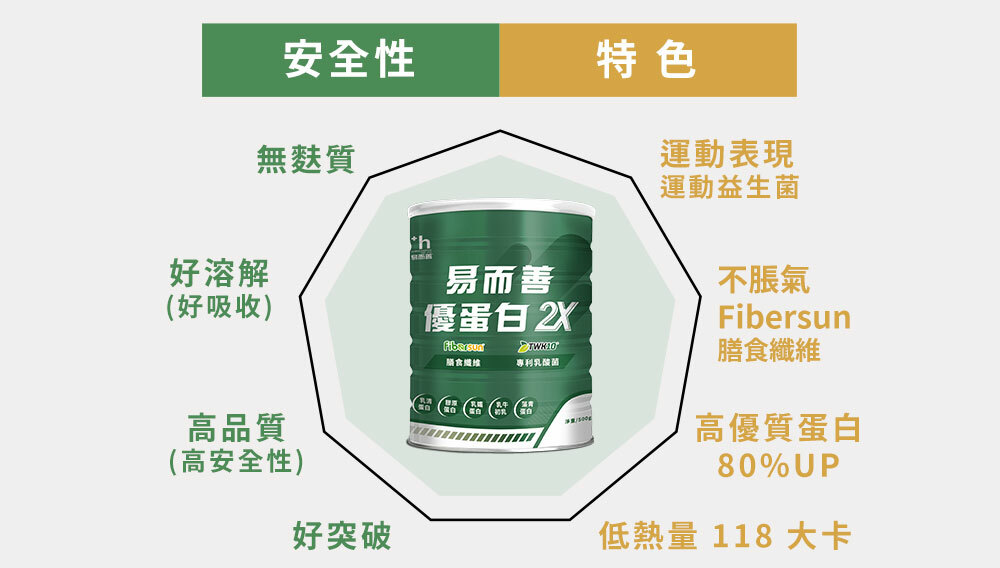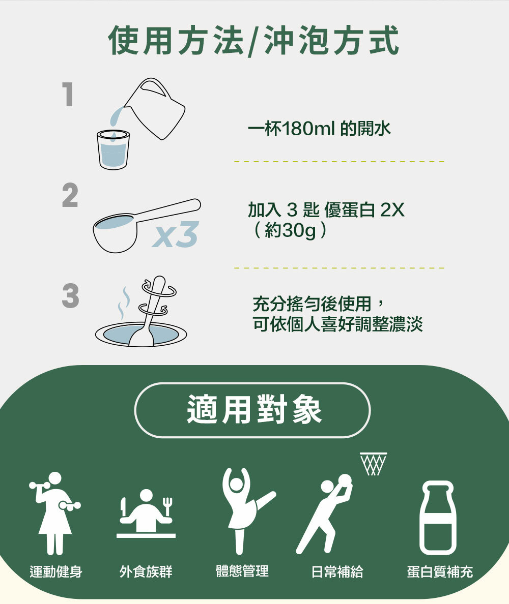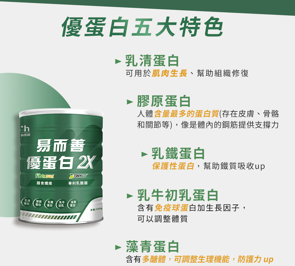 每份21.9公克蛋白質,由乳清蛋白、膠原蛋白、乳鐵蛋白、乳牛初乳蛋白及藻青蛋白組成,補充多元蛋白質營養,搭配運動讓肌肉生長事半功倍
