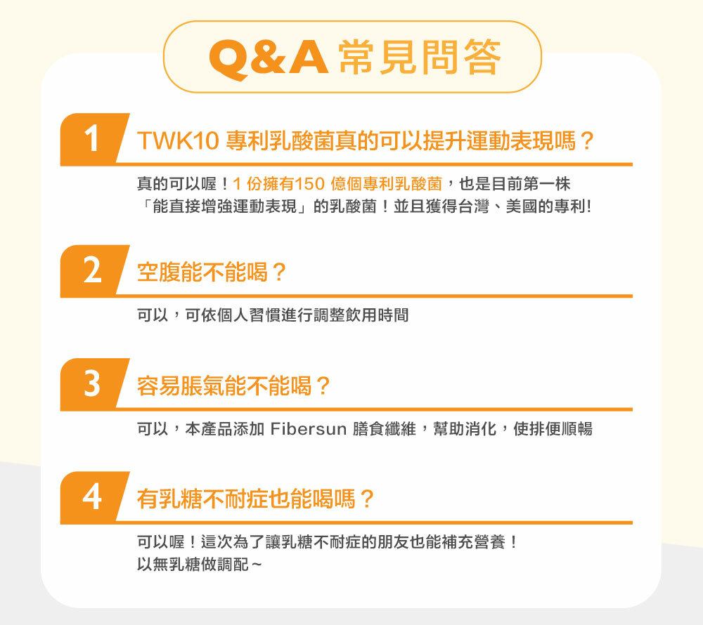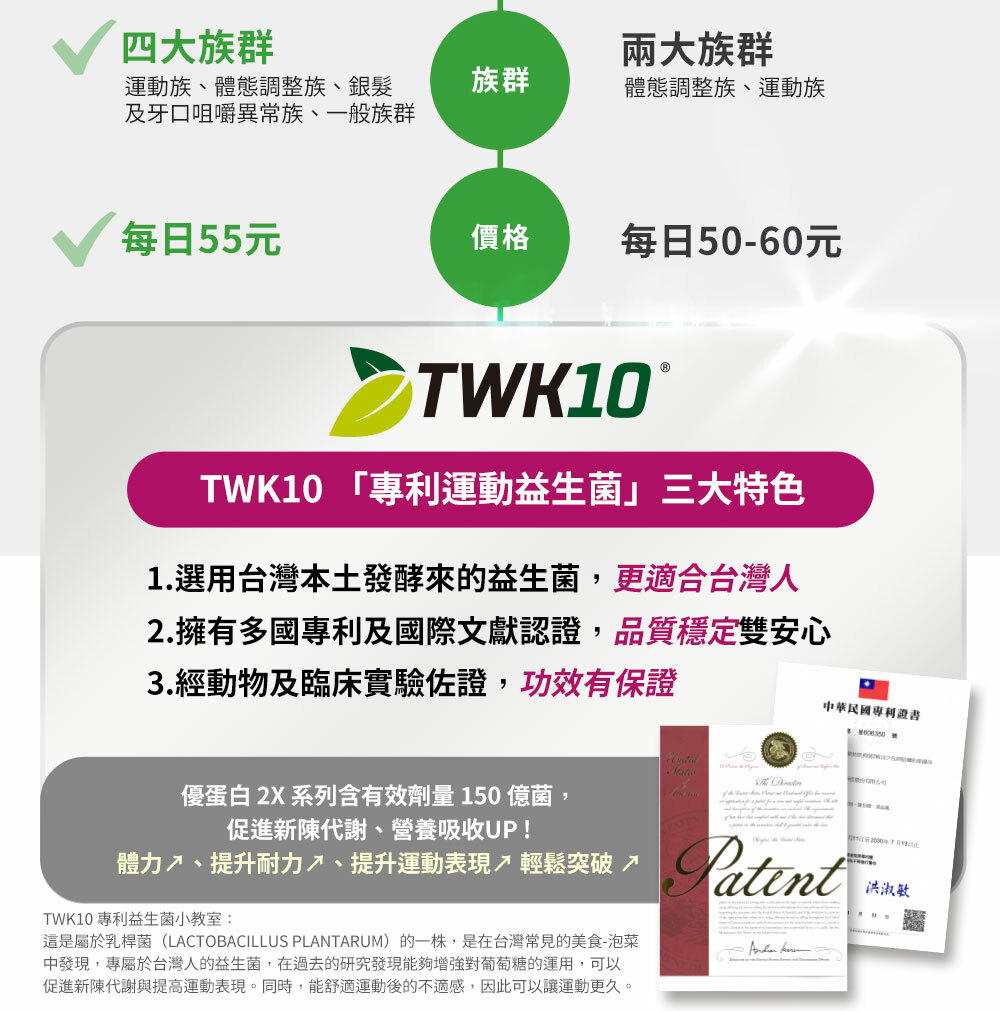 每份含有150億 TWK10® 專利乳酸菌,改善菌叢生態,調整體質,幫助更佳表現