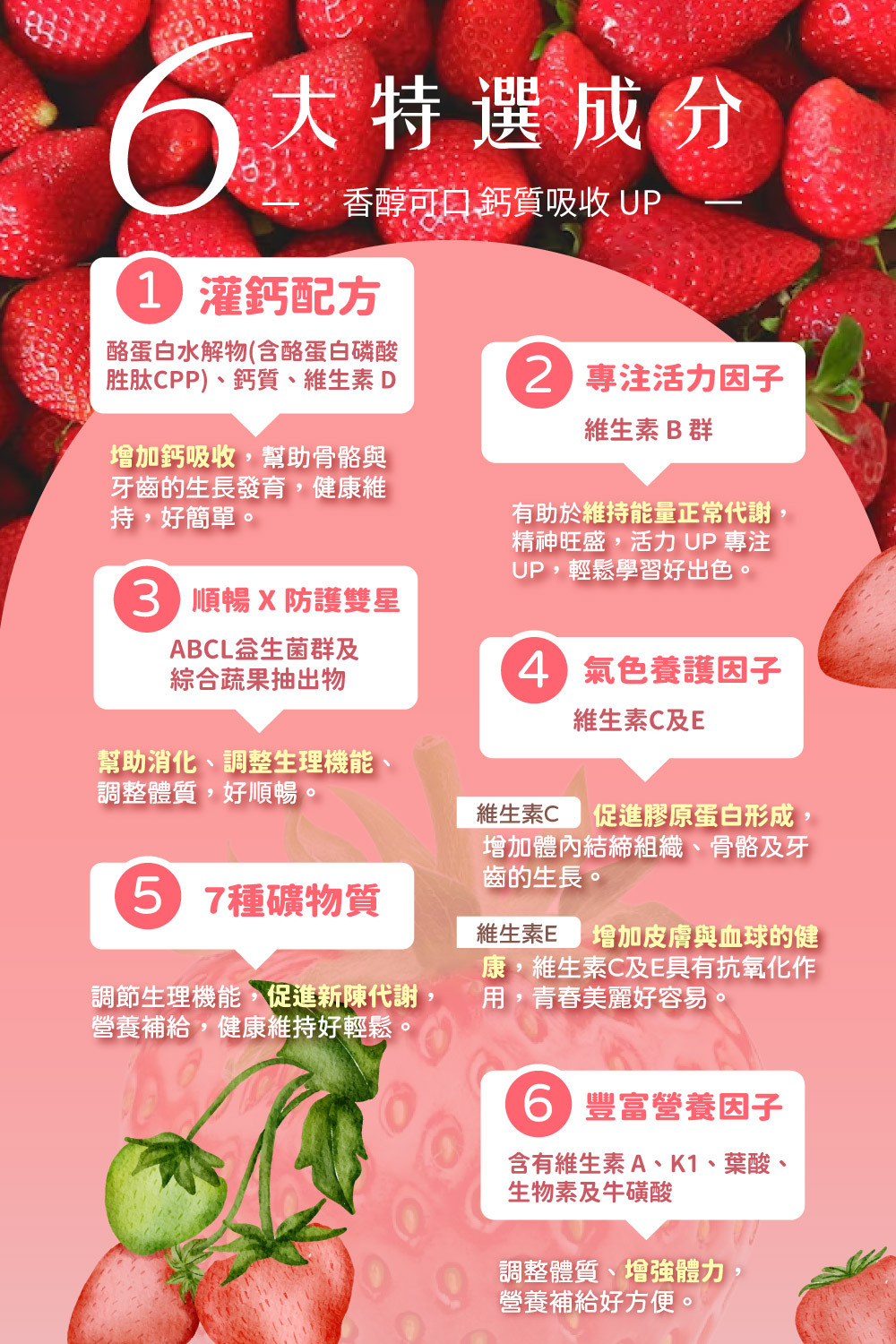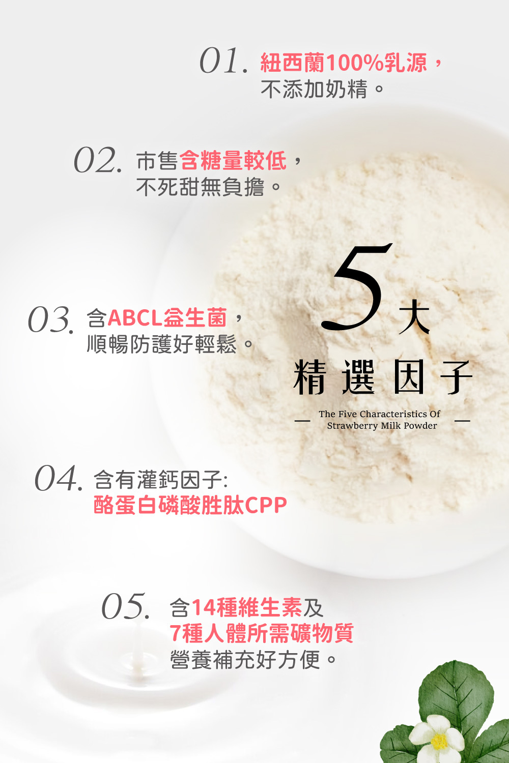 新鮮草莓乾燥成粉,搭配高鈣、高鐵及多種維生素及礦物質,