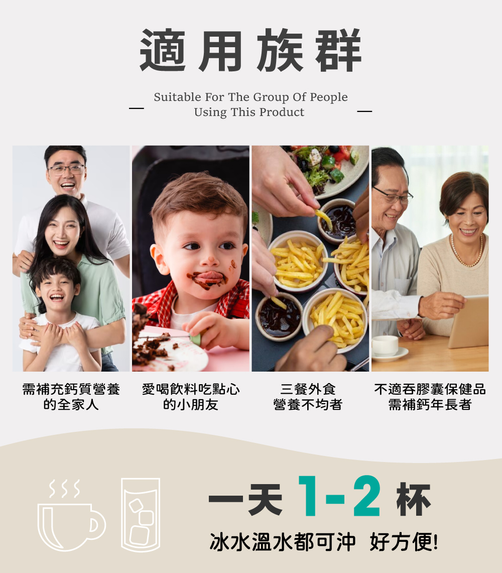 鈣質及維生素 D:幫助鈣質吸收,鈣質維持骨骼及牙齒健康,調節生理機能。