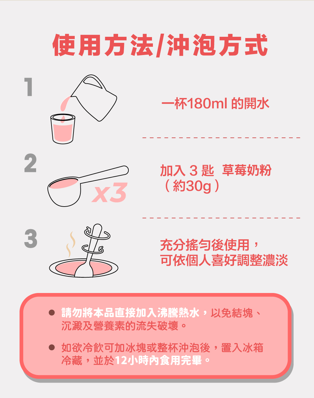 調製而成的草莓調味配方奶粉,早晚一杯草莓牛奶,冰冰喝熱熱喝都好喝!