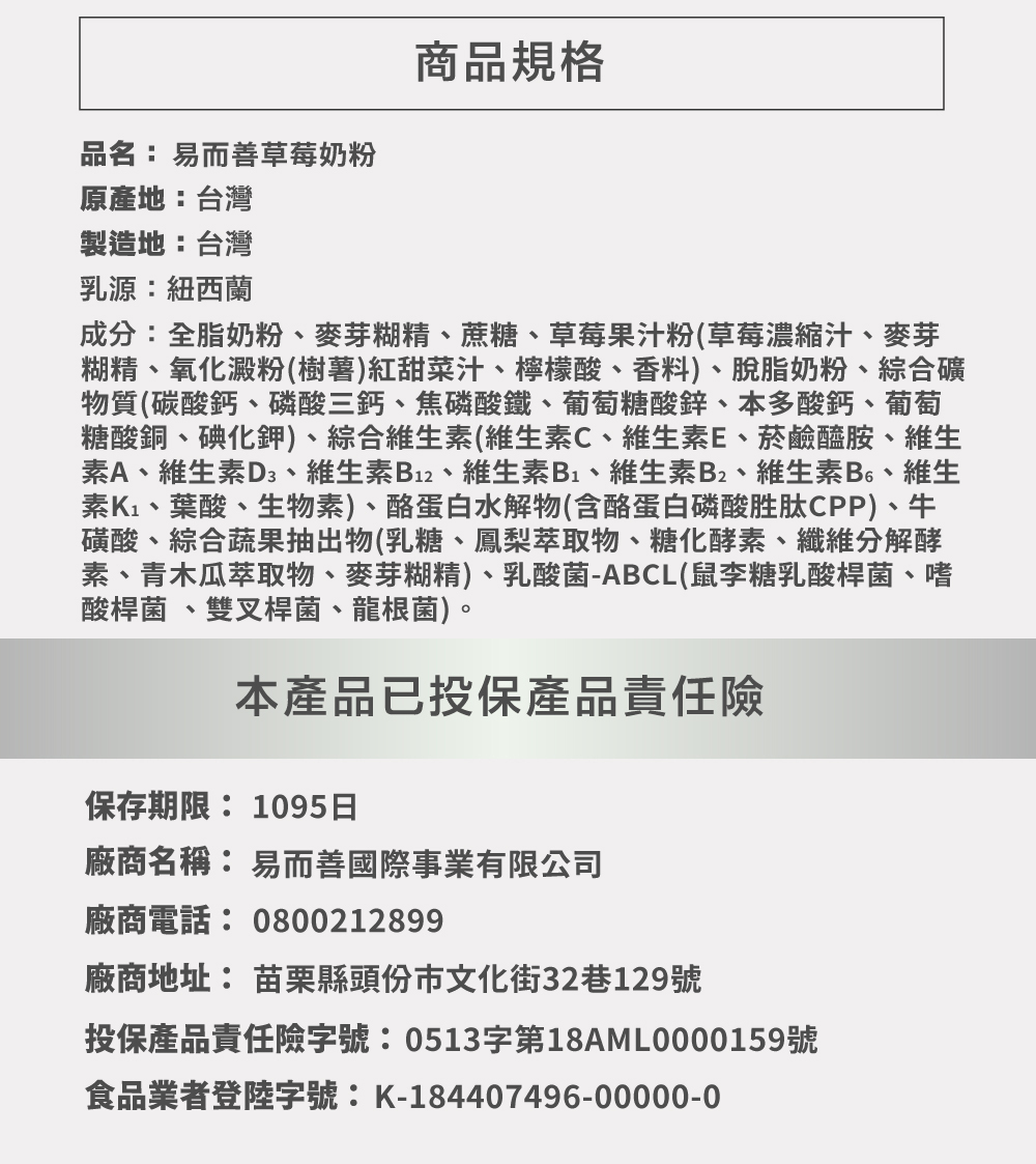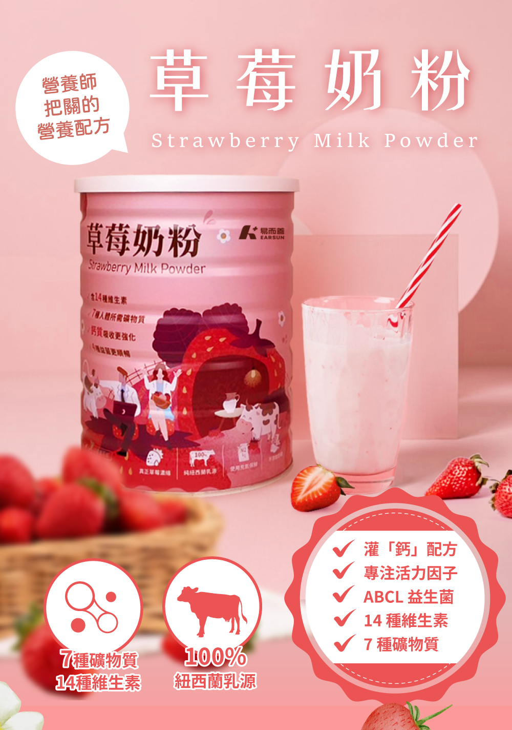 易而善 草莓奶粉,以紐西蘭嚴格品質控管的高品質 100% 紐西蘭牛乳,