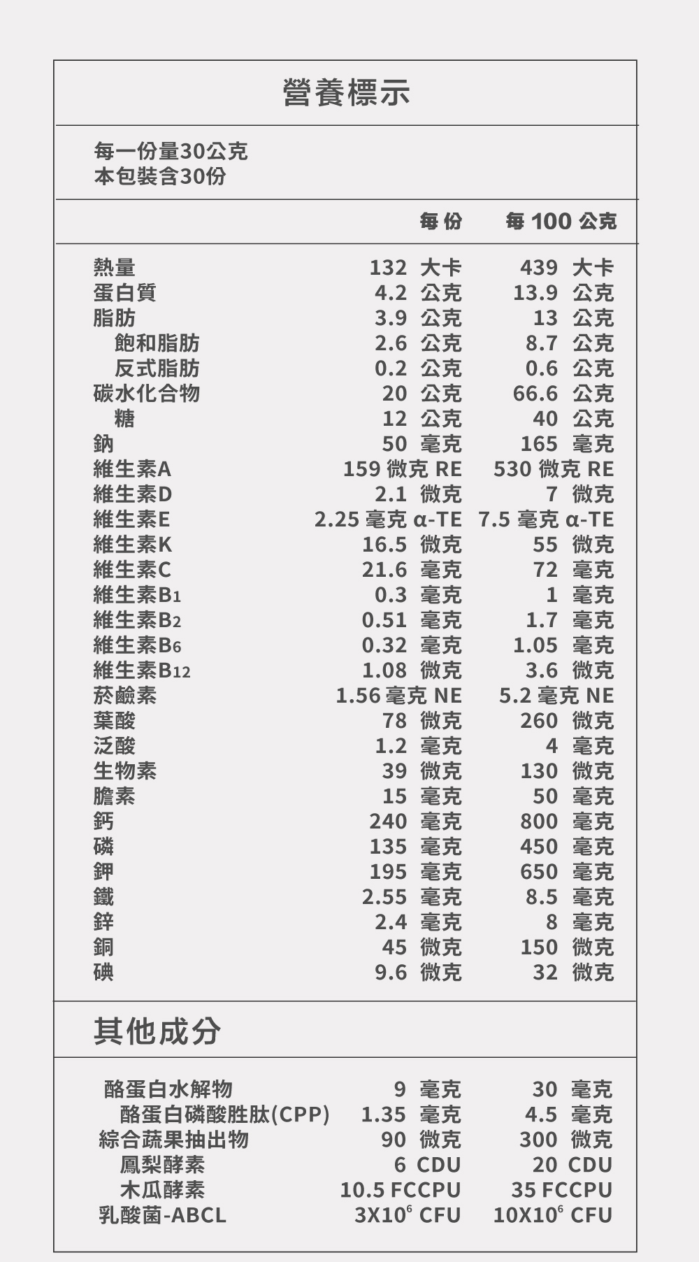 無添加奶精、香料,富含 13 種維生素、7 種人體所需礦物質,